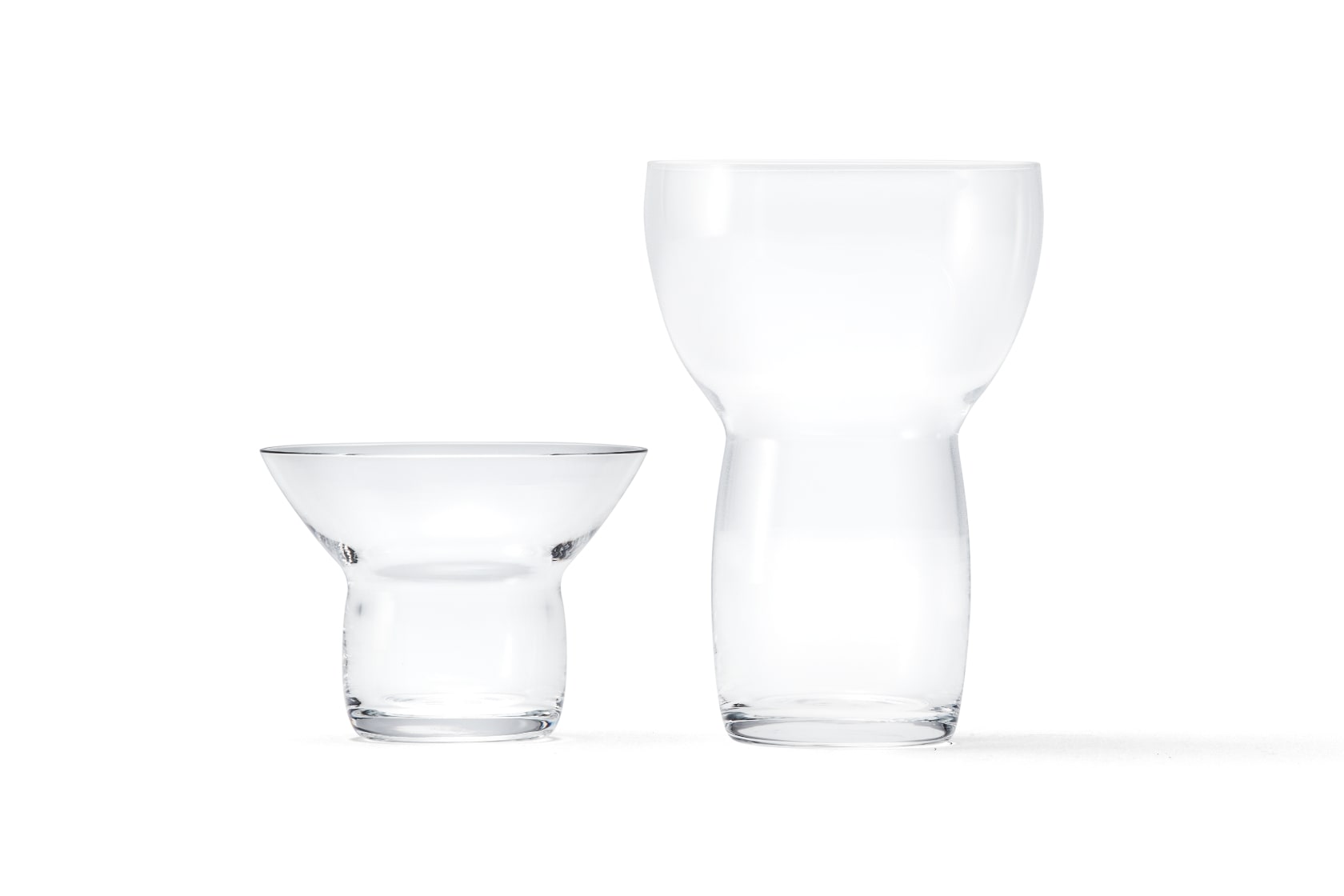 ふくよかな二つのカーブが印象的な、ワイン、吟醸酒、ビールを飲むためのグラスシリーズです。少し大きめの飲み口から、冷たく滑らかな液体が喉に滑り込む瞬間がこのデザインの醍醐味だと思います。どこか非日常的で祝祭的な雰囲気が、いつものお酒の時間を特別なものにしてくれます。