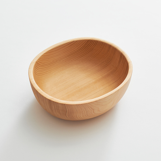檜でよくお椀を作るのですが、自分の作り方は刳りものといって木の塊を彫るだけの単純なものです。あら取りは機械を使い、鉋と鑿で仕上げていきますが、中を削る時は片手で持ち、鑿をもう一方の手に持ちながらやるので、一番木のことが分かります。檜はアテといって年輪の中に固いところがあります。これが曲者で、お椀は口当たりがいいように薄く削るのですが、固いところとやわらかいところを、同じ力で削ると割れてしまいます。加工しやすいので、慣れれば作れちゃいますが、やってみたらできましたではダメなので、木をどう見るかが重要です。木に合った形、木に合った加工の仕方、その木に合った物があるし、その物に合った木があるんだと思います。それが何なのか、いつも頭の中で考えながらやっています。