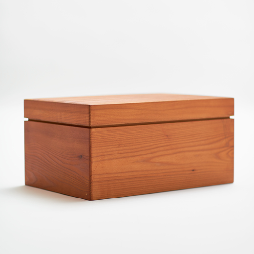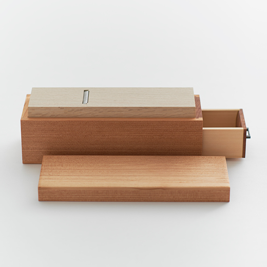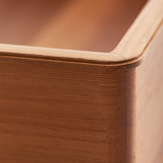 家業の木工に就いてしばらく経ち、集落の寄合いで「どうして唐松を使わないのか?」と聞かれたのは、30歳になるころでした。日本の木工といえば広葉樹があたりまえで、針葉樹には指物の仕事で杉や松に触れる程度。フシやヤニが多く、ネジレやワレがでる唐松を仕事の材として考えたこともなかったので、正直にそう返事をすると「…せっかく植えたんだで、使ってみてくれや。」という一言。それが僕が唐松を使うきっかけとなりました。唐松は確かに欠点があるものの、紅色の木味や木口まで通るはっきりとした柾目の縞模様がとても清らかに感じられました。以来、制作するものをできるだけ唐松でやってみようと、棚や簞笥、重箱やお箸などいろいろなものを形にしてきました。木を植えた土地主や木を伐採する林業者との結びつきの中で「木を物に工する」という役割を強く感じながら仕事に従事することができるようになって、改めて地元の材を使う意義を感じています。