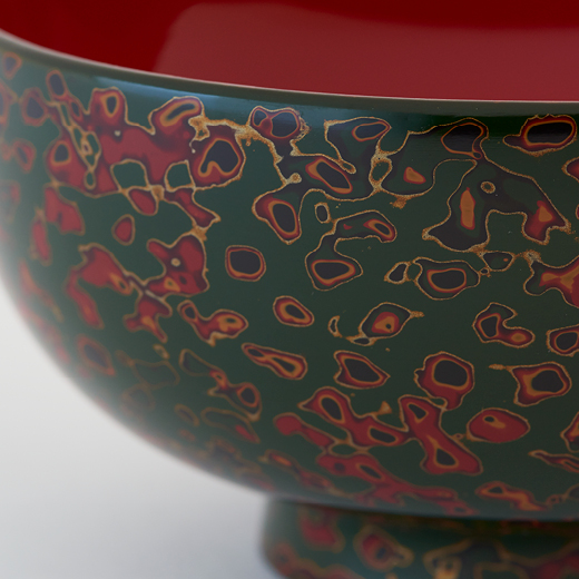 日本の漆芸には「蒔絵」があり、豪奢かつ精緻な造形は漆芸の一つの極まりをなすものです。「根来」はその対極にあります。黒漆の上に朱漆をかけた簡素・簡潔なもので、鎌倉から室町の時代にかけて隆盛した禅院「根来寺」で、修行僧が用いたものが原型となって広まりました。日用の道具である膳や盆、皿や椀を基本とするもので、長い年月の使用を経て、朱漆が磨り減り剥落して下地に塗られた黒漆が透けて見える風化の妙に、朽ち果てていくものの美しさを顕現させています。いわば生成の美ではなく退行していく風情として、根来の美は見たてられてきました。侘びを表象するものとして、茶室や庭、楽茶碗などがありますが「根来」もその代表的なものの一つとして、ここにとりあげています。