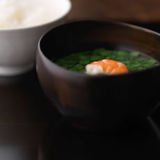 万葉の古歌を思い起こさせる落ちてきた木の実のような椀に木の枝を模した箸。海老の赤、にらの緑で鮮やかに二分してみせる汁の洗練が、自由でとらえどころのない器を錨のように食卓へ繋ぎ止める。