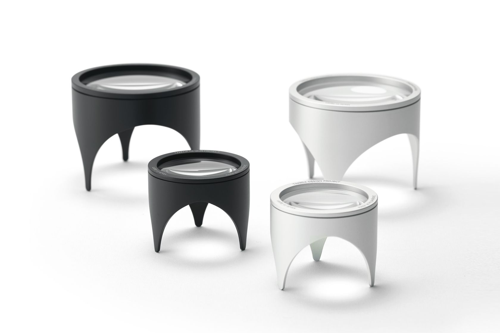 アルミニウムを削り出す高度な加工技術から生まれた3本足の美しいアーチ。光を取り込む工夫から生まれた機能美があります。何かを拡大するだけではなく、例えば織物の構造を見る「織物ルーペ」としても使えます。