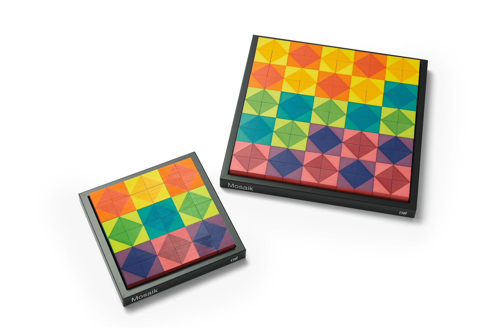 幼稚園の先生をしていたカトリン・キーナーのデザイン。幼稚園では動物や乗り物などをモチーフにしていたようだが、キーナーモザイクは幾何学的。自在に組み合わせて並べると美しい12色のパーツが独特の調和を醸し出す。