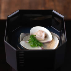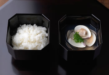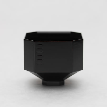 春慶塗は箱や盆に特徴がある。生地をロクロでひくような回転体が主流ではない。ならば箱を作る指物で椀を作ってみようと考えた。八角椀はそのような経緯で生まれてきたものである。角張った器といえば樂焼の初代、長次郎の黒樂に「ムキ栗」という茶碗があり、ぼってりと分厚い四角形が記憶にあった。側面は垂直面をなし、まるで箱のようであるが、裾はすっとすぼまり高台に収斂している。高台も四角である。そのユニークな形が頭に浮かび、そんな形なら指物の技術でできるのではないかと考えた。ただ、四角だと汁を啜るには不都合なので、八角形にして実用性を持たせている。