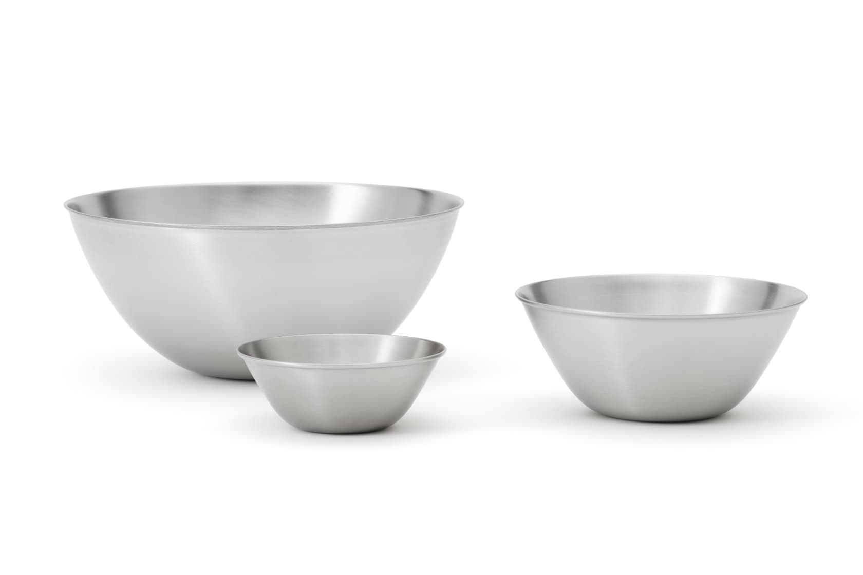 ステンレスのボールは調理器具として使われるものだが、この美しいフォルムは、そのまま器として食卓に登場させたい。おそらくはそのようなコンセプトでデザインされているはずで、要するに調理器具と器の両方の機能と美を兼ねている。 (日本デザインコミッティー著『デザインの原形』より)