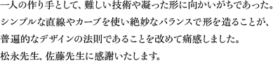 飛驒産業株式会社 1920年創業。2003年には、エンツォ・マーリ氏との協業開始。戦後、大量植林し放置されてきた杉に新しい価値を見いだす。伝統技術である曲げ木の応用から生まれた圧縮技術を活かし様々な研究に着手している。