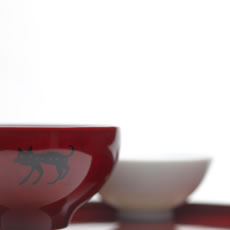 右も左も判らないグラフィックデザイン志望の学生だった芸大在学中に、突然“漆”の話を熱く聞かせて下さったのが、かの人間国宝松田権六先生であった。声も太くて、つややかな手、そして眼光鋭い顔をしていた。熱いツバキが顔に当たった記憶さえもまだ残っている。厳格で気の遠くなるような技の世界であった。あれが芸大で教わった最初の“日本”(Japanの語源は“漆”である)だったのだ。一方、子供の頃、祖母の家に素朴な絵の付いた漆器があった。漆器というよりは、簡単なうわ薬のついた普段使いの木製雑器という感じだった。強度のための簡単な漆塗りが長じた結果、浅い色の漆器になっていったのではないかと思う。それ故に、墨絵を施しても透視出来る。それが春慶塗の特徴になったと想像している。素朴な生活の知恵が、地域の風土、慣習によって様々に枝分かれしながら、様式化されていくのがとても面白い。